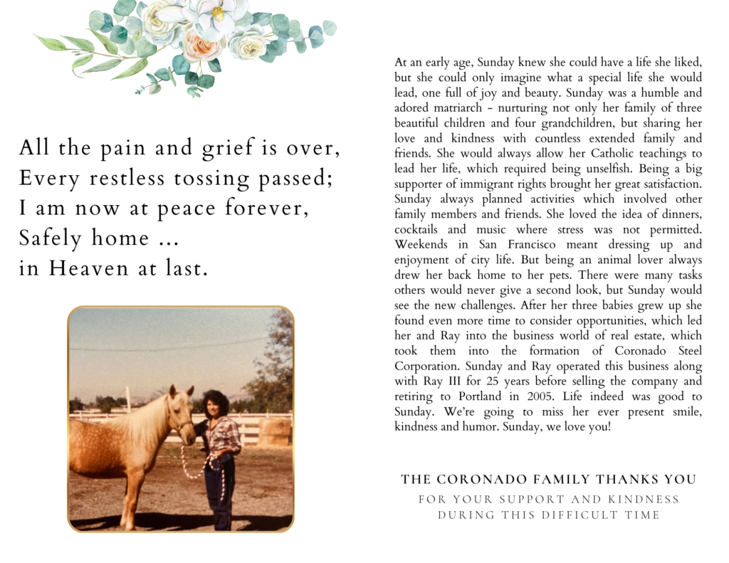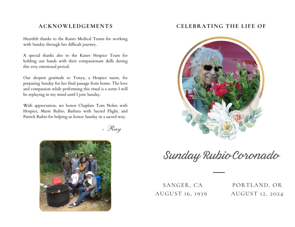 A Celebration of Sunday’s life was held on August 24, 2024 at McLoughlin Promenade overlooking Willamette Falls in Oregon City, Oregon. Stories, reflections, and messages can be shared with the family at www.SundayCoronado.com.